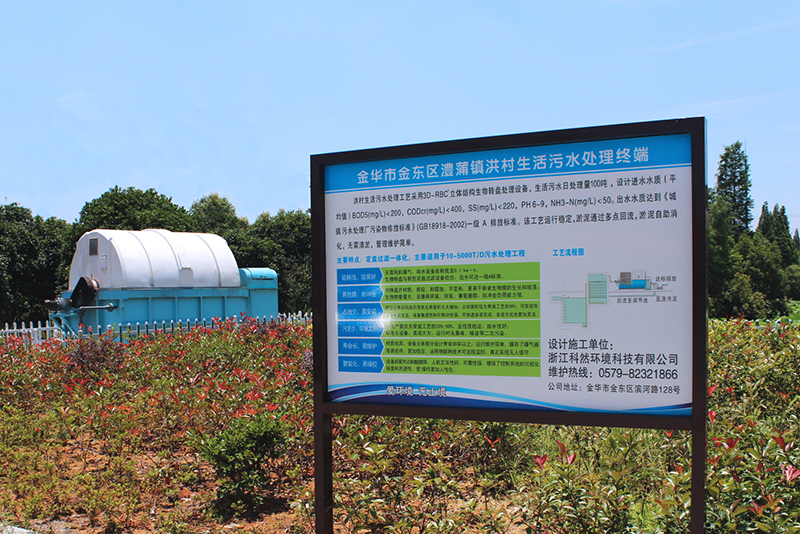 金華市澧浦鎮洪村生活污水處理工藝采用3D-RBC立體結構生物轉盤處理設備,生活污水日處理量100噸,